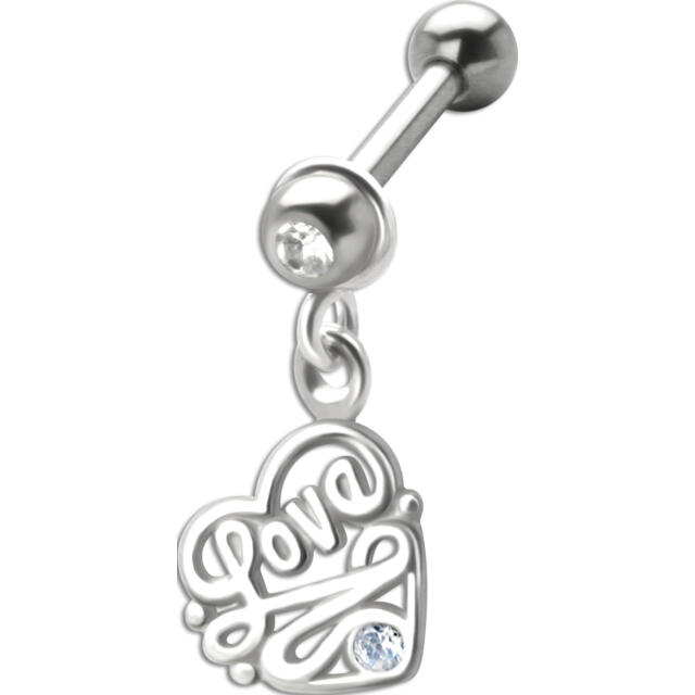 Helix ear piercing made of 1.2x6mm 316L surgical steel with a HEART LOVE pendant in 925 sterling silver, 2 clear crystals. The piercing can be worn on the right or left ear.