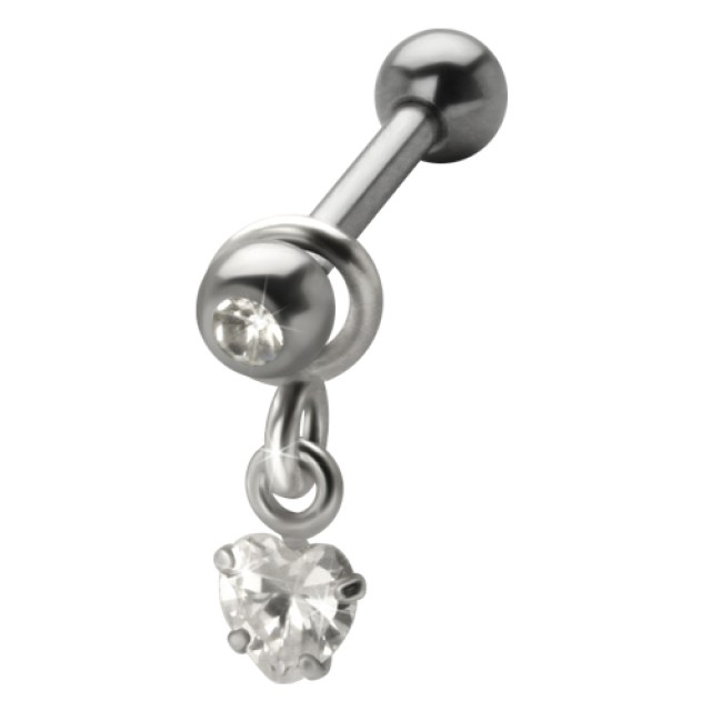 Helix ear piercing made of 1.2x6mm 316L surgical steel with a HEART pendant, white crystal set in 925 sterling silver. The piercing can be worn on the right or left ear.