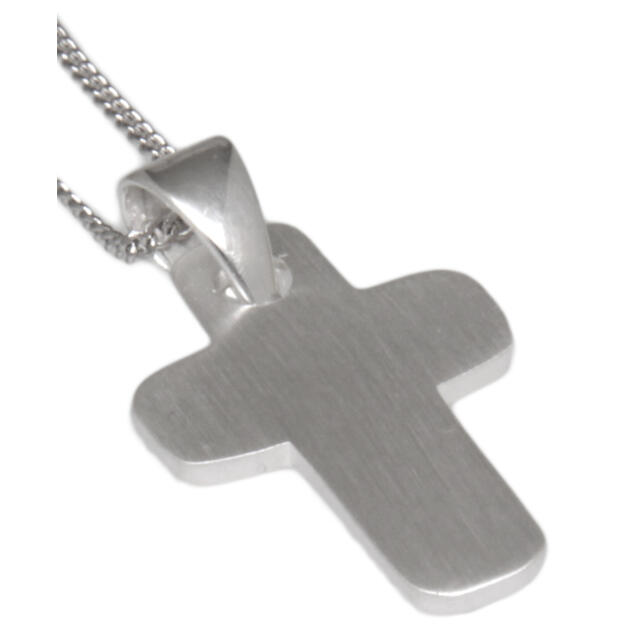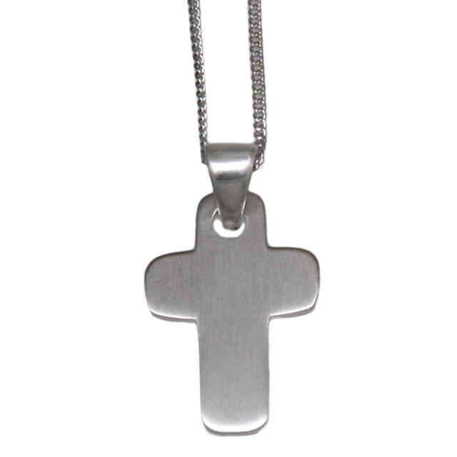 Cross pendant made of 925 sterling silver, matted front and back, dimensions 22mm length x 15mm width, thickness 1.2mm. The weight of the pendant is 2.8 grams. The pendant comes WITHOUT a chain, which must be ordered separately. This pendant is also available in our engraving shop with the item number LAS-925CR-023 with an individual laser engraving.