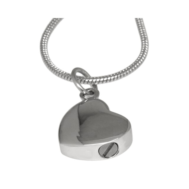 Ash pendant, small heart, made of high-gloss polished stainless steel. Height 15mm, width 14mm, the item is 5.4mm thick. The pendant comes with a 50cm steel chain and is presented in a gift box. Including funnel and stainless steel needle for filling.