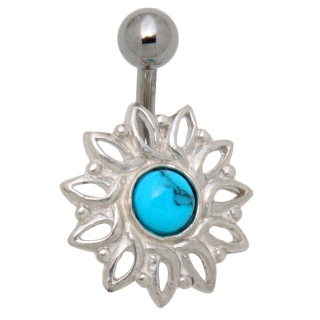 Belly button piercing American Indian 1.6x10mm with semi-precious stone - material banana: 316L surgical steel - dimensions banana: 1.6x10mm - material design: 925 sterling silver with semi-precious stone - dimensions design: 19x19mm - the piercing is set with a turquoise semi-precious stone - the 5mm ball can be unscrewed - Jewelry bag can be ordered under the article number IC-Bag We still offer a large selection of American Indian designs.