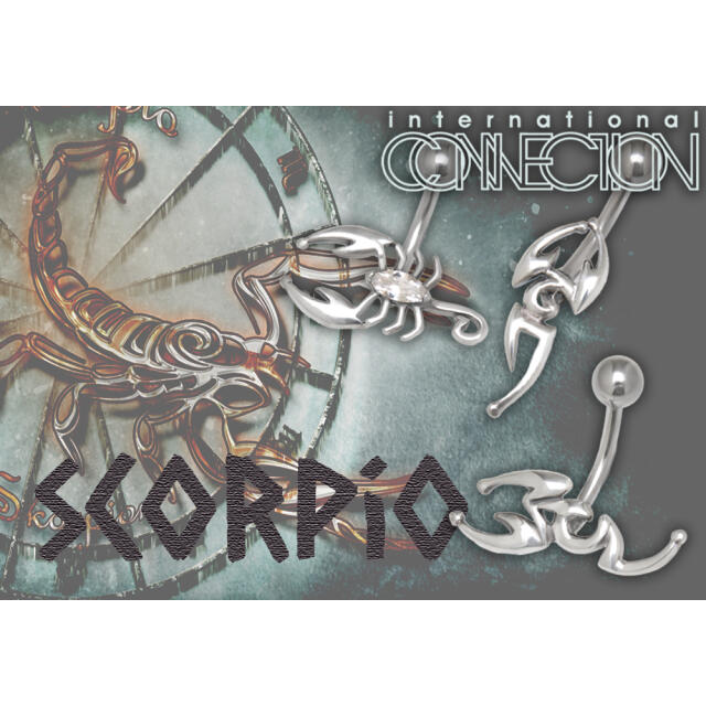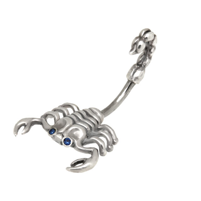 Belly button piercing made of a 1.6x10mm steel banana with a plastic 925 silver scorpion design - banana material: 316L surgical steel - banana dimensions: 1.6x10mm - design material: 925 sterling silver - design dimensions: head 12x15mm, tail 3x11mm - design: is a 2-part scorpion with crystals in the eyes - the tail of the scorpion can be unscrewed to open it - delivery takes place in a jewelry bag An unusual design with many details.