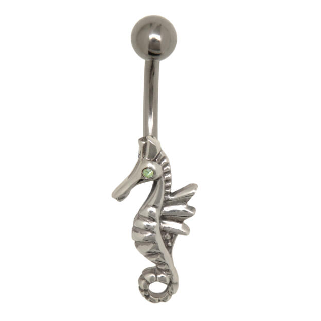 Belly button piercing with 925 silver seahorse design and crystal stone - material banana: 316L surgical steel - dimensions banana: 1.6x10mm - material design: 925 sterling silver - dimensions design: 20x9mm - design: a seahorse with a crystal as an eye - jewelry bag can be ordered under item number IC- Bag to be ordered A beautiful unusual design for seahorse lovers.