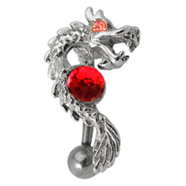 Belly button piercing 316L surgical steel rod and a 925 sterling silver dragon design Swarovski special effect crystal - resembles a disco ball. The piercing is inserted into the navel from above.