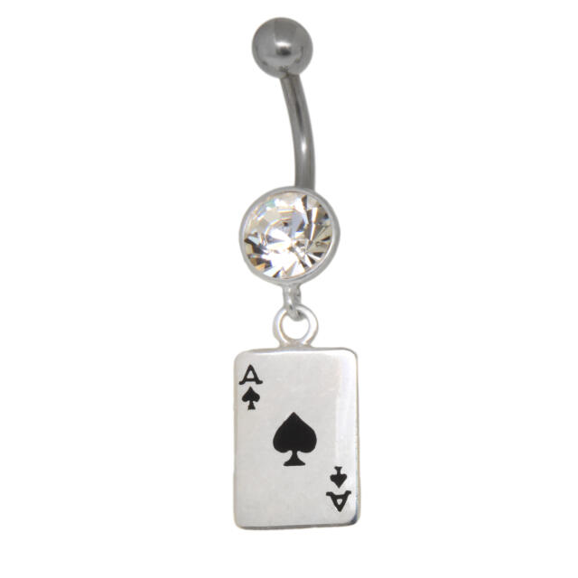 Belly button piercing with a stone setting and ace of spades card made of 925 silver