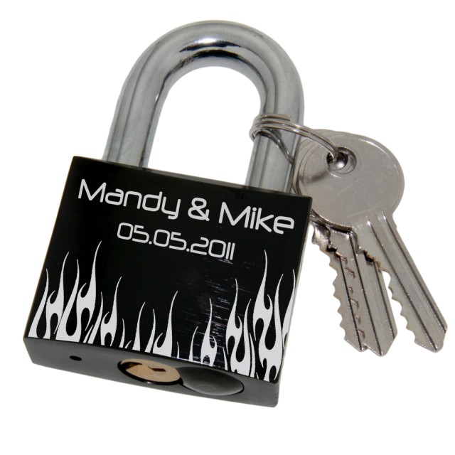 Black love lock made of aluminum 50mm with flame motif and your individual engraving