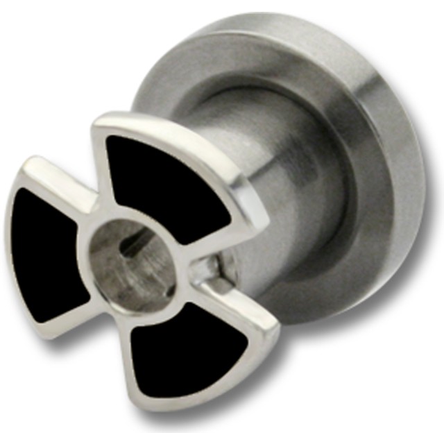 Earplug made of 316L surgical steel. The design is 925 sterling silver - a black nuclear warning sign. The plug can be unscrewed on one side and is available in several sizes.