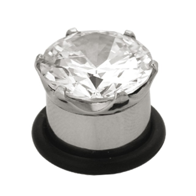 Earplug made of 316L Surgical Steel with a cubic zirconia crystal. The ear hole stretcher is closed with a rubber, which is slipped over one end of the plug. The plug is available in six diameters.