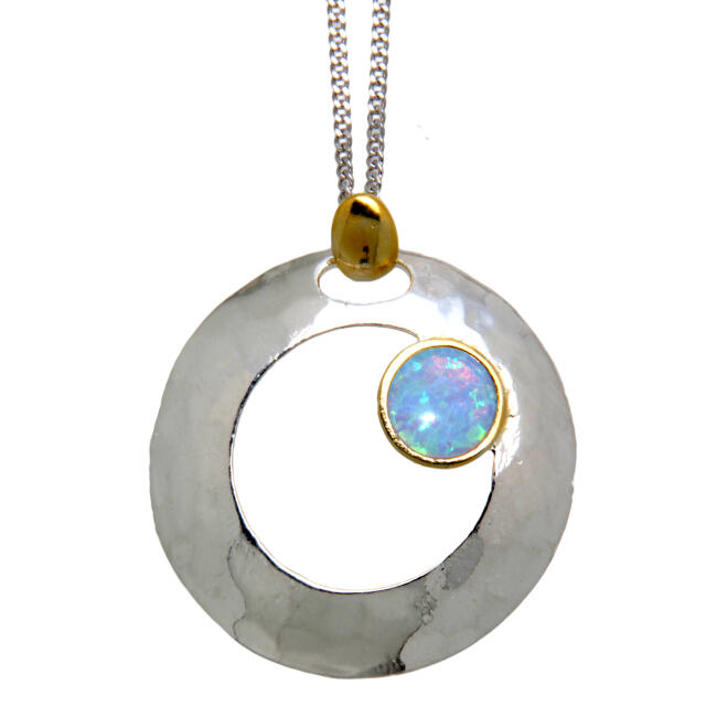 Pendant made of 925 sterling silver, partially gold-plated with synthetic opal. The pendant comes with a silver chain. Diameter of the pendant 27mm, surface is slightly curved and individually structured - item is handmade. The insert shimmers in delicate shades of blue. We ship the item in jewelry packaging.