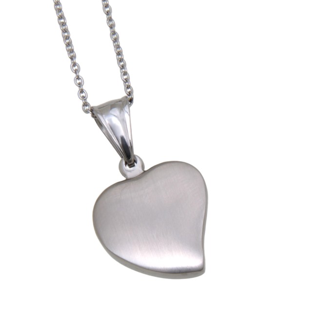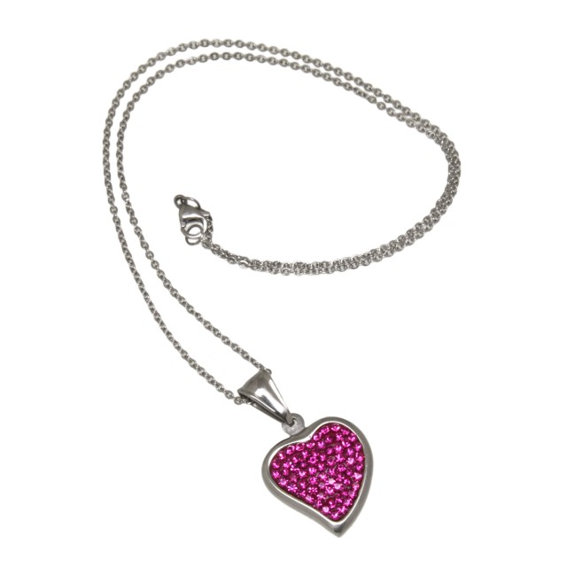 Heart-shaped pendant made of stainless steel with pink crystals - Material: satin stainless steel - Size: 18x19mm without eyelet - The front is completely set with pink crystals - Includes a 45cm long anchor chain with a lobster clasp - Supplied in a jewelry box Engraved on the back, the Pendant for a personal gift.