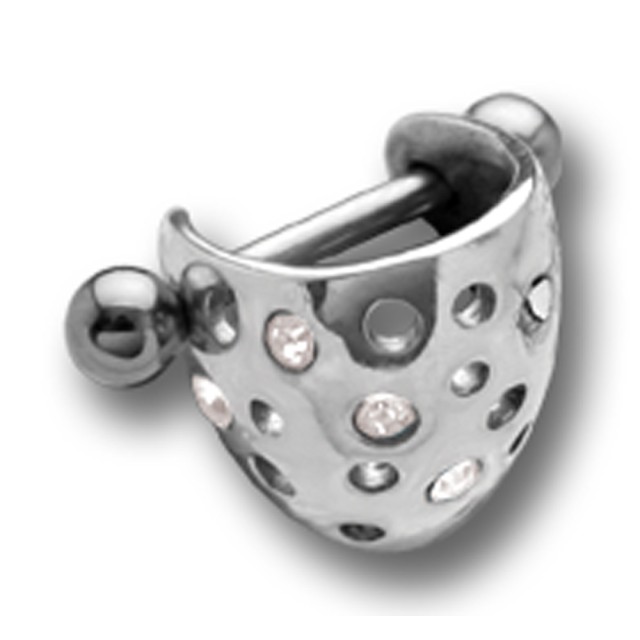 Helix ear piercing made of 1.2x6mm 316L Surgical Steel with a steel design and small Swarovski stones. The piercing can be worn on the right or left ear.