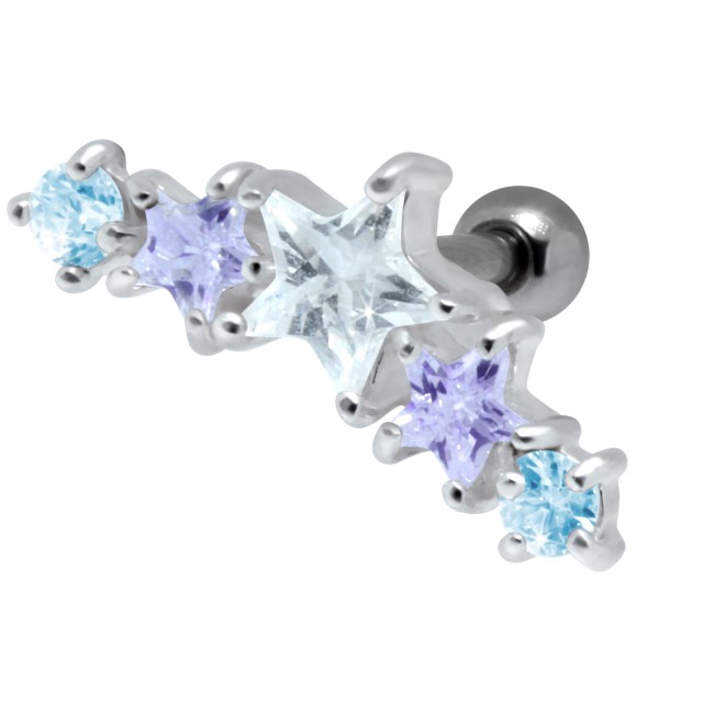 316L Helix ear piercing 1.2x6 with 925 Sterling Silver design with clear, lavender and aqua blue cubic zirconia. The piercing can be worn on the right or left ear.