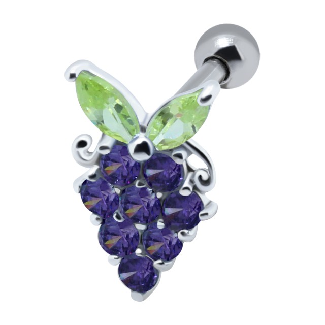 TIP ear studs for the helix with 1.2x6mm helix ear piercing made of surgical steel. Motif grapes with leaves. Motif is made of 925 sterling silver, the grapes and leaves are zirconia in amethyst (purple) or peridot green. Almost 12mm high and 8mm wide. On the small picture you can see how and where to wear something like that. We ship the item in jewelry packaging.