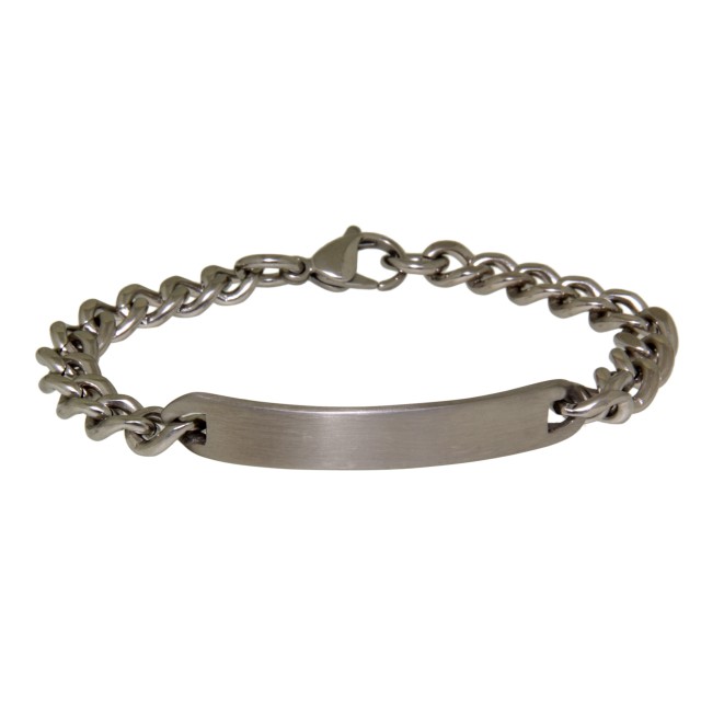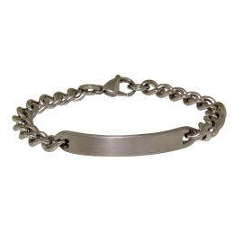 Stainless steel ID bracelet with frosted plate. The bracelet has a length of 21cm and a width of 9mm. The glossy plate is 52mm long and 9mm wide. The bracelet closes with a lobster clasp and the plate is curved for more comfortable wearing. We also offer this bracelet in our engraving shop with an individual engraving.