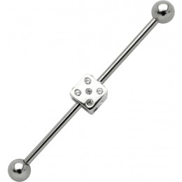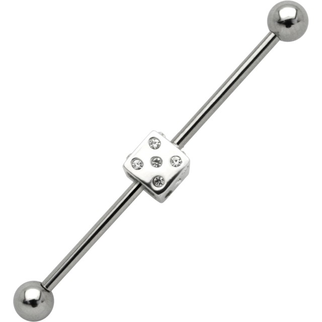 Industrial barbell ear piercing consisting of a 316L surgical steel barbell with a 925 sterling silver cube design and small clear Swarovski crystals. The barbell dumbbell has two 5mm steel balls which can be unscrewed. The piercing is available in three lengths and only in crystal.
