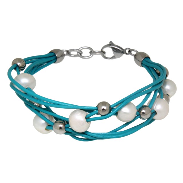 Leather bracelet turquoise with white freshwater pearls and silver artificial pearls