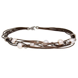 Necklace made of 8 thin old gold leather cords. The necklace is 41cm long plus a 2cm extension. The necklace closes with a lobster clasp. In the leather cords are six large white and nine steel beads. The necklace is also available in other colors.