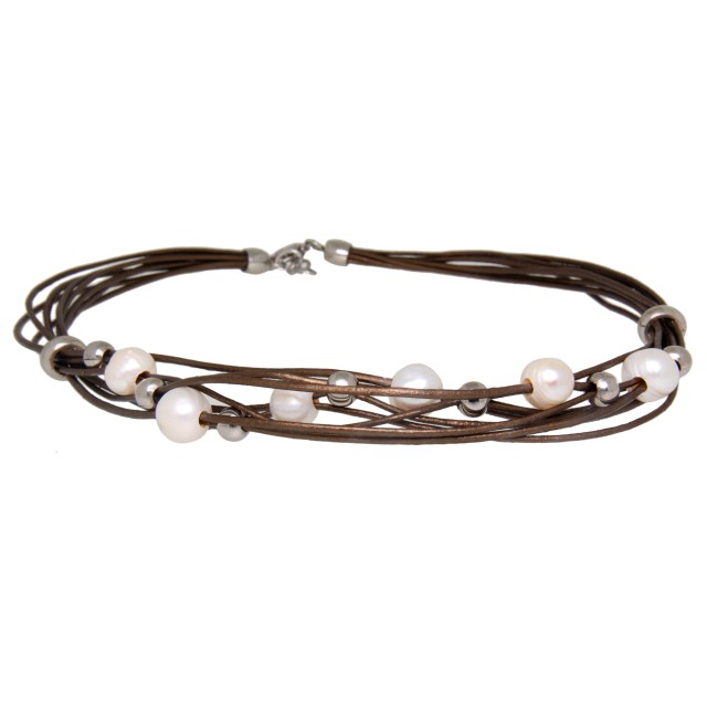 Leather necklace antique gold with lacquer pearls