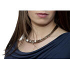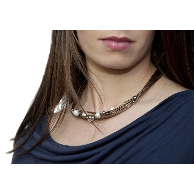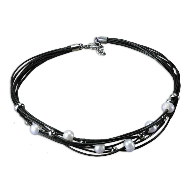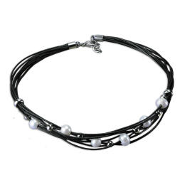 Necklace made of 8 thin black leather cords. The necklace is 41cm long plus a 2cm extension. The necklace closes with a lobster clasp. In the leather cords are six large white and nine steel beads. The necklace is also available in other colors.