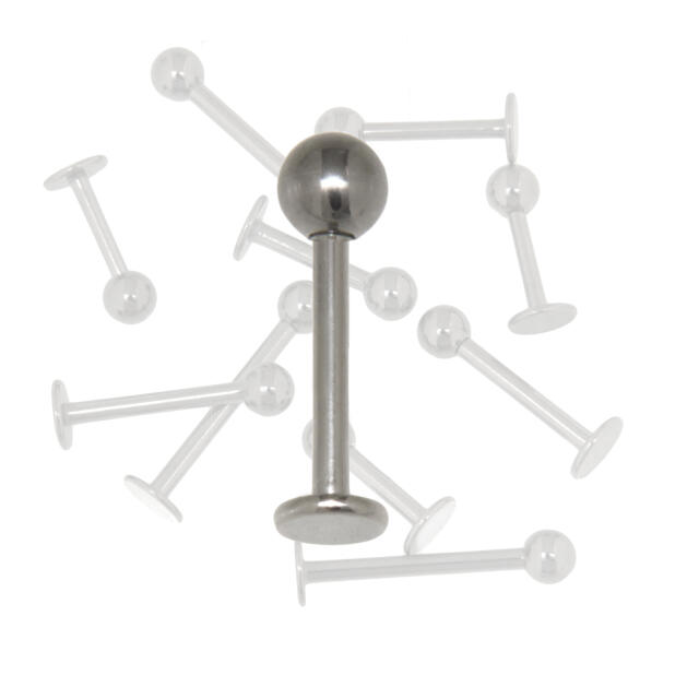 Micro-Labret lip stud made of surgical steel 1.0 and 1.2mm thickness and different lengths - Material: 316L surgical steel - Labret thickness: 1.0mm and 1.2mm - Labret length: 6mm, 7mm, 8mm, 9mm, 10mm, 12mm - Ball size: 3mm - One side is flattened and the ball can be unscrewed - jewelry bag can be ordered under the item number IC-Bag A great basic piercing for a variety of uses