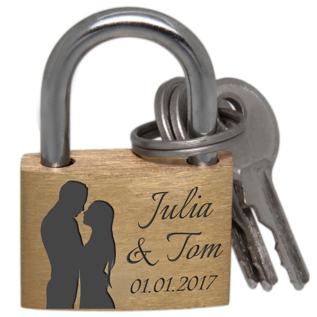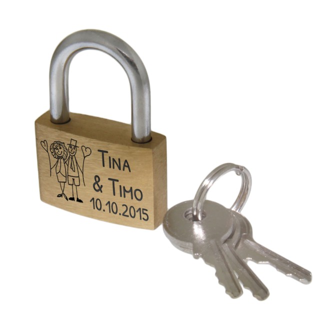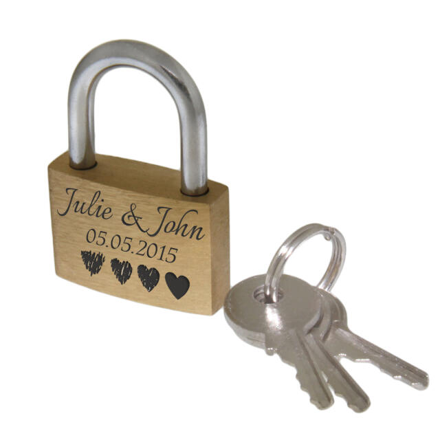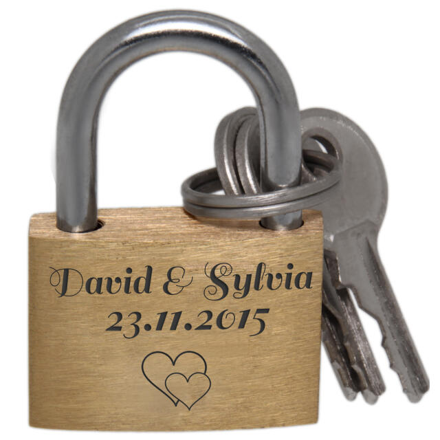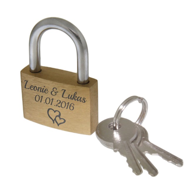 Mini love lock 20mm wide made of brass with your desired engraving - Material: brass - Size: 20x15mm - Engraving: as created by you with the design tool - The lock comes with two keys - Supplied with a jewelry bag - On the front and on There is NO advertising logo on the back Since it is a padlock, there may be very light scratches or streaks on the lock.