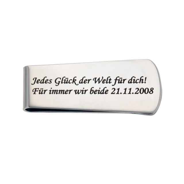 Money clip made of matt stainless steel - large - with individual engraving - material: stainless steel - size: 22x52x6mm - surface: polished - engraving area: 35x17mm - engraving: as created by you in the design tool - DESIGN NOW INDIVIDUALLY - the image shows just one of many clever ones possible examples - Supplied in a decorative pouch Great gift idea with style - provided the recipient has cash. An accessory for people with a big wallet. The money clip can be engraved on the front and back. The banknotes can be inserted on both sides, ideal when traveling for a foreign currency. The price includes a one-sided individual engraving of letters, numbers and symbols. Graphics and the back cost extra. If you have any questions, just give us a call: 02271 980080. We are lightning fast: We engrave your item within 1-2 working days after receipt of payment. Unless we need to speak to you and we can't reach you. The engraving is applied to the engraving surface using the latest fiber laser technology, whereby only tenths of a millimeter of the material are removed, but this is permanent. If you like, we are happy to publish your article - since this is also in our interest, we need your consent for this. You tell us - or not, as you like - when you place your order.