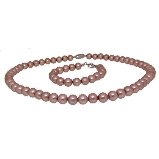 A classically beautiful set of patent pearls - the bracelet is 17 cm long plus a 3 cm extension with a stainless steel lobster clasp. The necklace has a length of 46 cm and a practical magnetic clasp. The color of the lacquer pearls is antique rose. The beads have a diameter of 8mm.