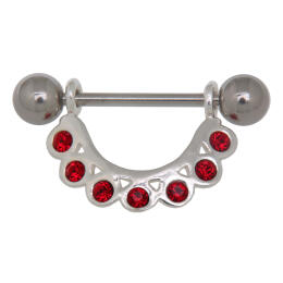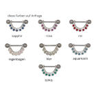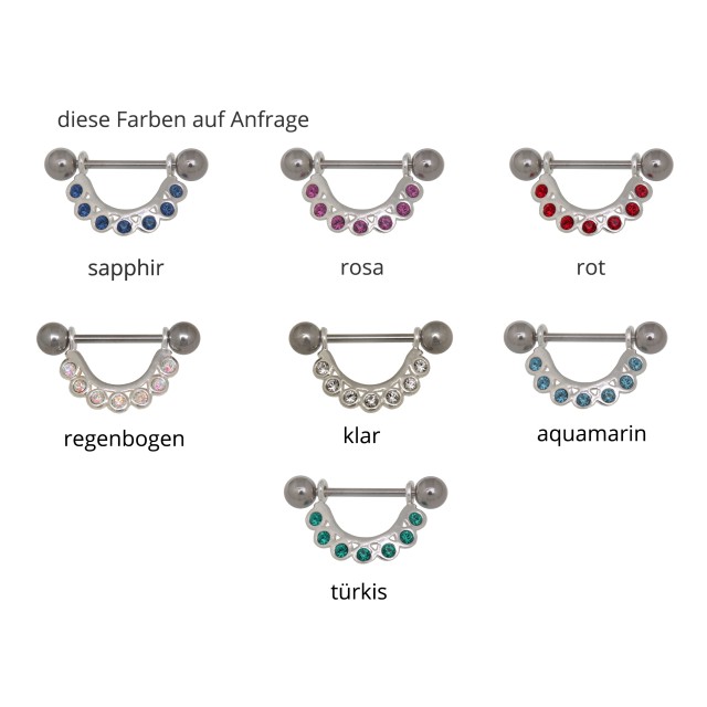 Nipple shield made of 925 sterling silver with a timeless design The 7 crystals are available in various colors. The sign has an inside dimension of 15 millimeters and a maximum width of 22 millimeters. The matching barbell dumbbell has a bar length of 18 millimeters and is 1.6 millimeters thick. The screw balls are each six millimeters in diameter. The plug and the locking balls are made of allergy-friendly surgical steel that meets the requirements of the EU nickel regulation