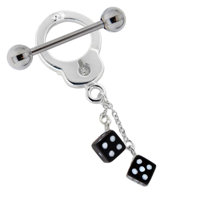 Nipple piercing sign made of 925 sterling silver with a handcuff design. The motif has a diameter of 10 mm, two small plastic cubes dangle underneath. The dice are available in several colors, click on the respective color to see the full article. A matching barbell dumbbell made of 316L surgical steel is included in delivery.