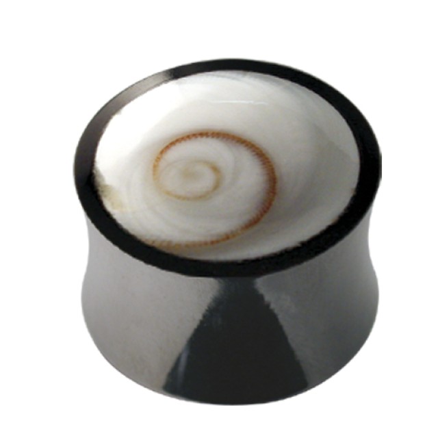Organix ear plug made of water buffalo horn. The eye of Shiva can be seen on the plug. Only available in five sizes. The plug should only be used in healed tissue.