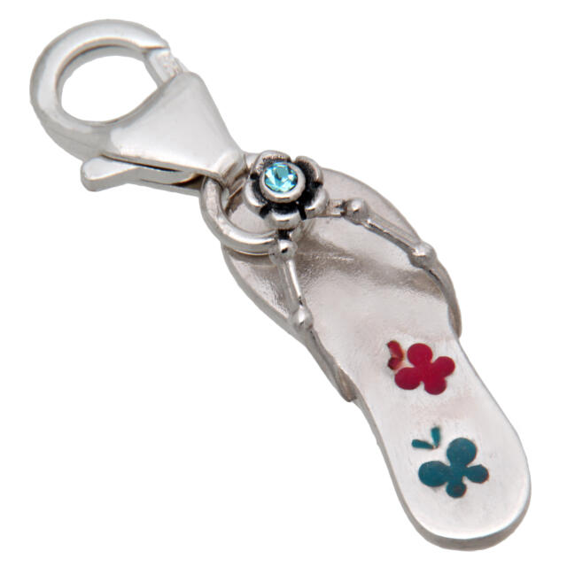 Flip-flop pendant in 925 sterling silver, rhodium-plated, with a small crystal. The pendant (18.5mm length) is equipped with a mini carabiner (14mm length), also made of silver, for hanging on a charm bracelet. Total weight about 1.8 grams. From International Connection.