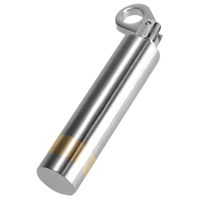 Cylindrical pendant made of stainless steel with a gold-colored stripe. The movable eyelet ensures that the pendant can move freely around the neck. We deliver this elegant stainless steel pendant without a necklace. The pendant has a diameter of almost 8mm, it is about 44mm long and weighs about 13-14g.