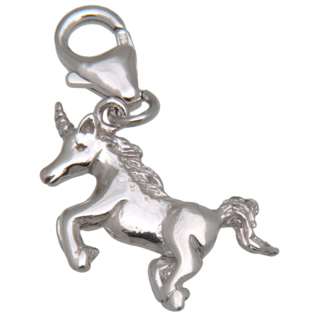 Unicorn pendant made of 925 sterling silver, rhodium-plated. The pendant (20.5mm) is equipped with a mini carabiner (14mm), also made of silver, for hanging on a charm bracelet. Total weight about 2.6 grams. From International Connection.