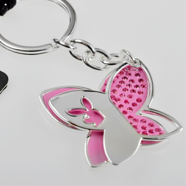 PLAYBOY key ring silver plated with butterfly and pink crystals