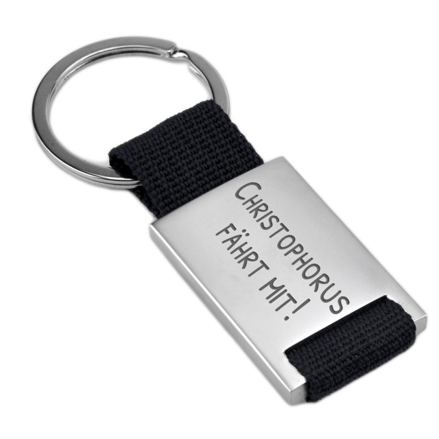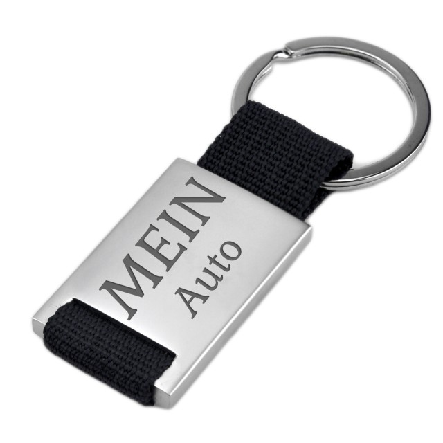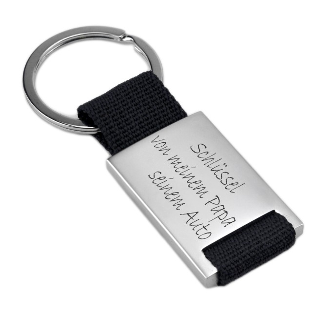 Rectangular key ring with nylon and metal and your desired engraving - material: metal and nylon - size of the engraving area: 35x27mm - surface: matted - engraving: as created by you in the design tool - the pendant has a total length of 90mm - the item comes in a jewelry pouch delivered A great gift for a driver's license or for your first house key For Mother's Day / Father's Day / Birthday, we would be happy to engrave a child's drawing or a poem in your personal handwriting for you - for an additional charge of 15.00 euros. Please email us the drawing or the handwritten poem as a jpg. A great gift for a driver's license or for your first house key. The item can be engraved on both sides, the second side at an additional cost. With the help of our software you can create a personal and original gift for little money. The engraving is applied to the surface to be engraved using the latest fiber laser technology, whereby only tenths of a millimeter of the material are removed, but this is permanent. Please note: Articles that we personally manufacture for you by lasering your engraving on them are excluded from the right of exchange and return for precisely this reason: So please no spelling mistakes or transposed digits!