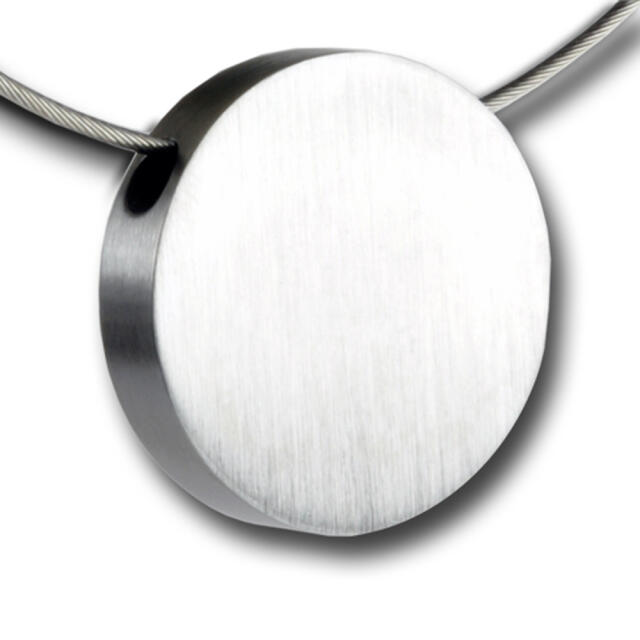 Round pendant made of stainless steel, both sides are frosted. Diameter 25mm, the article is 5.2mm thick, the opening for the chain has a diameter of 30mm. The scope of delivery includes a steel ring of 46 cm in length with a twist lock. Weight of the pendant approx. 18 grams. This article is ideal for attaching an engraving - please have a look in our engraving shop, there you can also design the pendant according to your own ideas.