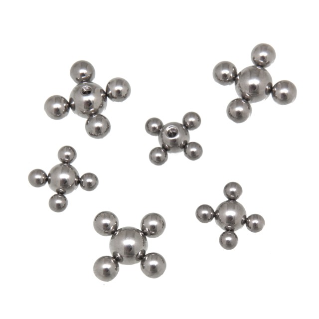 Screw attachment Atom made of surgical steel with 1.6mm thread in two sizes - Material: 316L surgical steel - Thread: 1.6mm - Size: 5mm and 6mm ball - 4 smaller balls are attached to the balls - Supplied in a jewelry bag We offer many more unusual ones screw attachments in our shop.