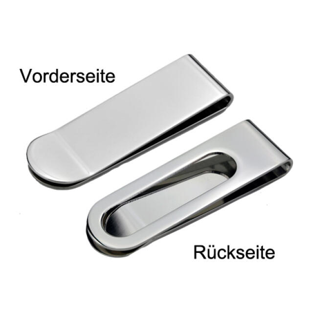 Polished stainless steel money clip, dimensions: 16 x 52 mm with cut-out on the back. The article has a height of approx. 6 mm. The article is also available with an individual engraving in our engraving shop. The delivery takes place in a gift box.