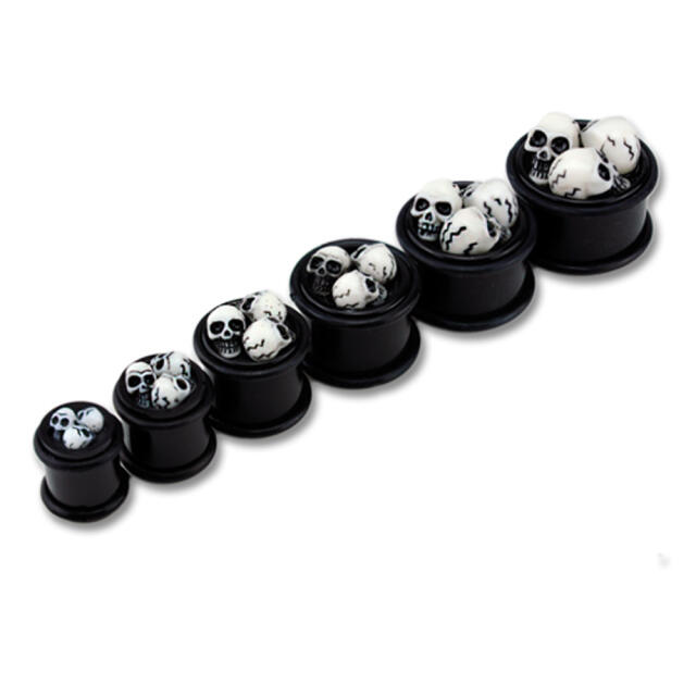 Silicone plug black with three skulls in different thicknesses - material plug: black silicone - thickness plug: 10mm, 12mm, 14mm, 16mm, 18mm and 20mm - length plug: length is approx. 13.7mm - design: there are three on the front of the plug 3-dimensional white skulls - The plug comes with two rubber rings - A jewelry bag can be ordered under the item number IC-Bag This piercing is a real eye-catcher on your ears