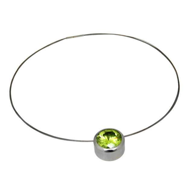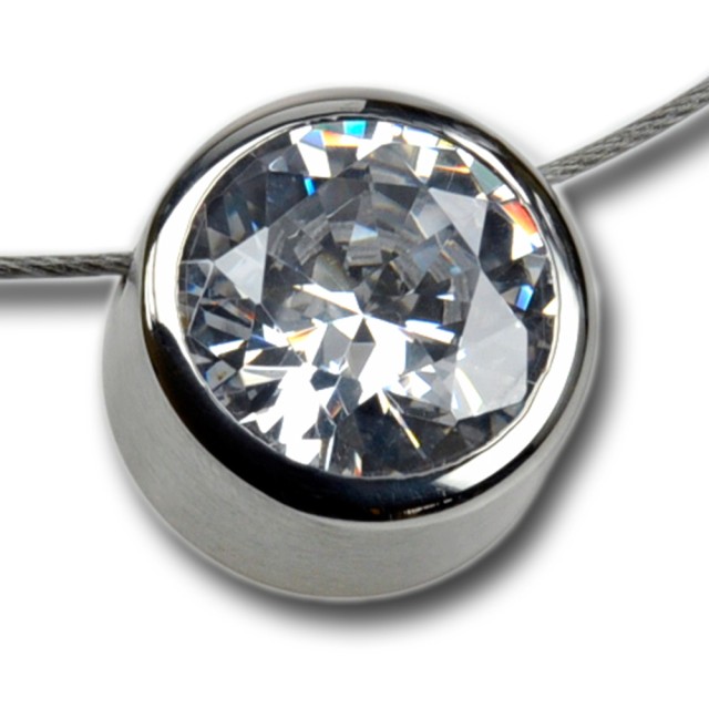 Stainless steel pendant with a large zircon. The pendant has a total diameter of 19.5mm, the stone has a diameter of 16mm and the thickness is 12mm. The pendant has a weight of approx. 17.3 g. The pendant is available in four colors. The scope of delivery includes a steel ring approx. 45 cm long with a magnetic clasp.