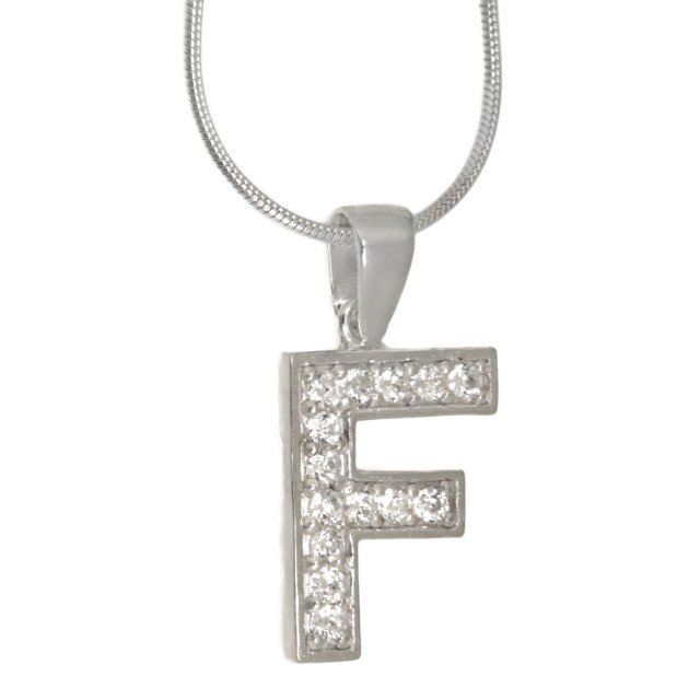 Pendant made of 925 sterling silver with the letter F. The pendant is set with small clear zirconia. There is an eyelet for the chain at the top of the pendant. The pendant comes WITHOUT a chain. The delivery takes place within one working day and the pendant is packed in a jewelry pouch.