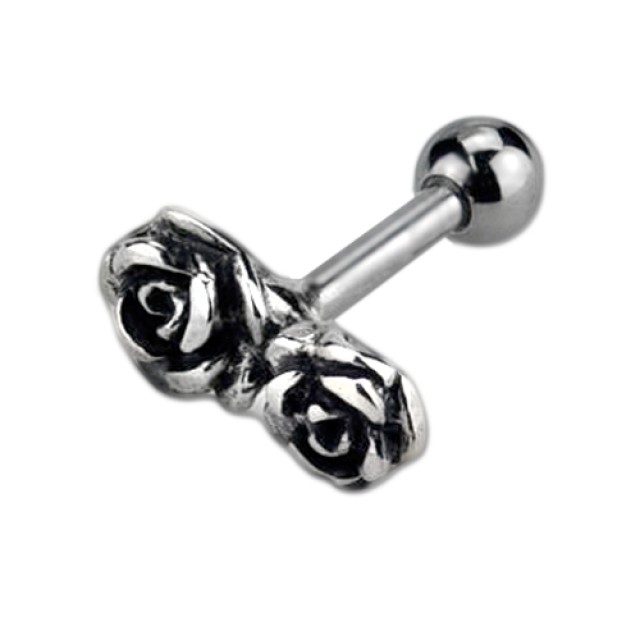 Helix TIP ear piercing with a 925 silver rose design - Material design: 925 sterling silver - Material barbell: 316L surgical steel - Length barbell: 1.2x6mm - Dimensions design: 5x9mm - The design are two different sized rose blossoms - The small 3mm ball is unscrewed to open - The piercing can be worn on the right or left ear - Supplied in a jewelry pouch A timeless piercing for everyday use in the office or in your free time.