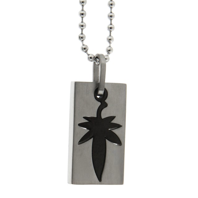 Two-part stainless steel pendant with PVD black dyed ganja leaf and ball chain