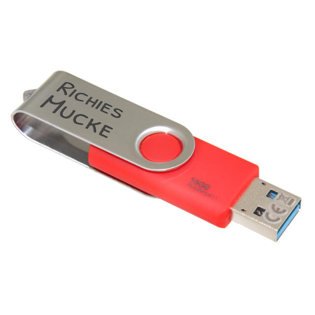 USB stick with engraving on the rotatable steel case, red. USB 3.0 (backwards compatible) 16GB European manufacture Toshiba components full warranty on electronic components rubberized plastic red